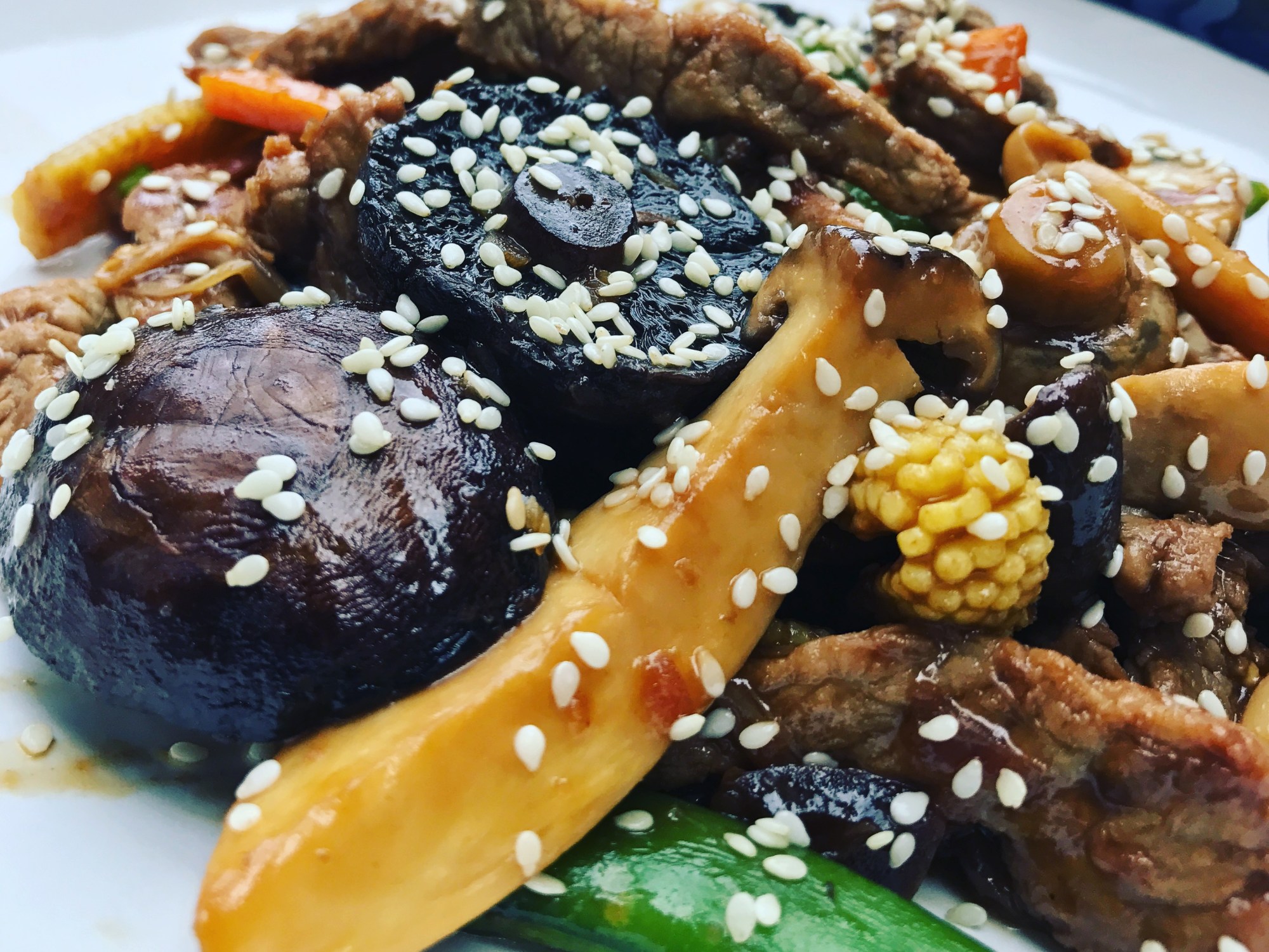 I love mushrooms, the more the better. Mixed with a simple stir fry they make such a difference. The roasted portobello mushrooms in this recipe just add another level of flavour and are a perfect match with the steak and the sesame oil. Add whatever veg you prefer in a stir fry and if you only have one type of mushroom just go with that, it will still taste nice.